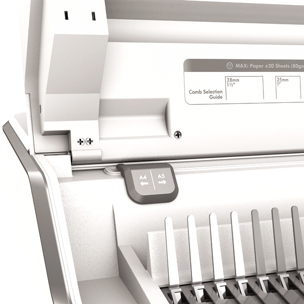 VAZBA: Děrovací kapacita až 20 listů 80 g papíru. Kapacita vazby až 300 listů, max velikost hřbetu 38 mm. Je vhodný pro intenzivní kancelářské použití. Vkládání děrovaných listů shora pro snadné setřesení a tím bezchybnou perforaci.